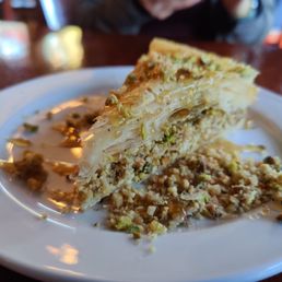 Service is great. Food is wonderful. The interior could certainly use a make over. And the outdoor patio would be so much fun with a few details. Anyway. We shared a lamb gyro. Excellent. And shared a Chocolate Galaktoboureko. Very very interesting!! Not sweet. The whipped on top has a slight sweetness though.